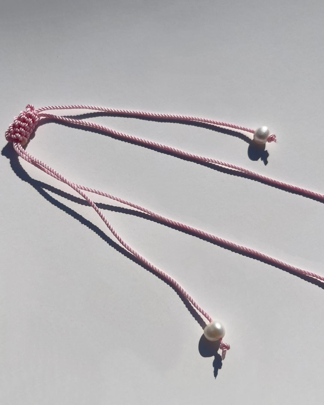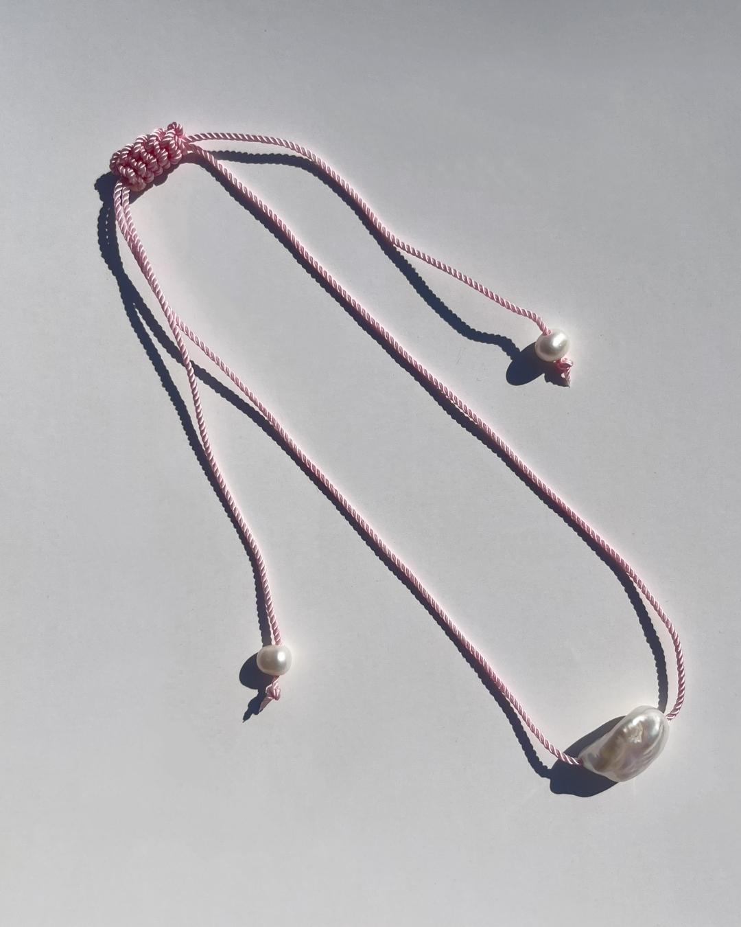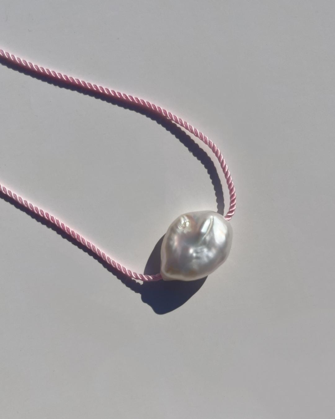 The Baroque Cord Necklace - Rose feature unique, AA+ Rare Natural White Big Baroque Pearl pendant accompanied by adjustable baby pink nylon knotted cord with mini freshwater pearl ends. Also available in black and light blue cords.