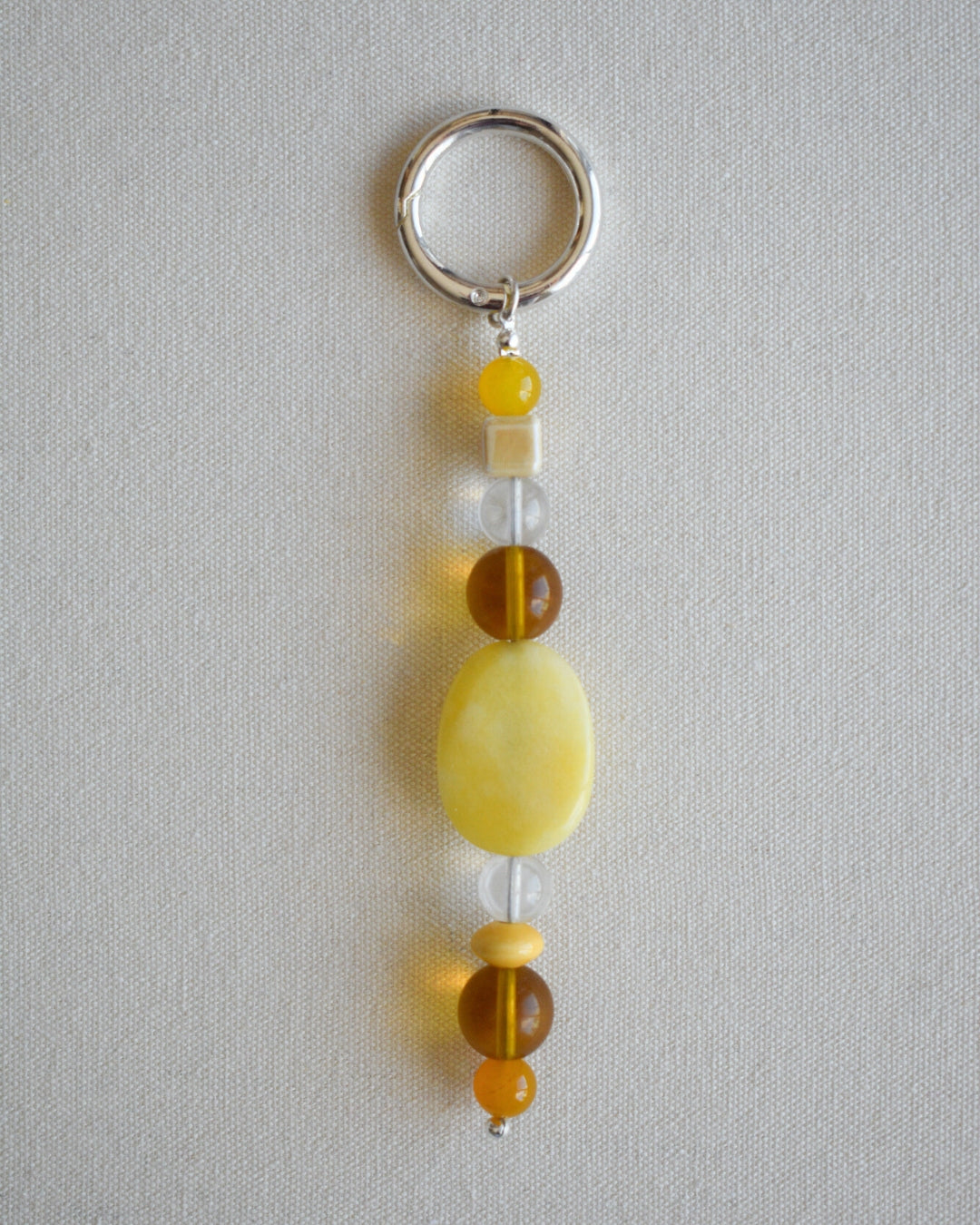Each Buttercup Beaded Bag Charm is made from upcycled beads, semi precious stones, glass, ceramic beads, vintage-sourced beads, and hand-selected glass beads. This versatile accessory can be styled as a bag charm or key chain, offering a distinctive way to add texture and individuality to your everyday carry.