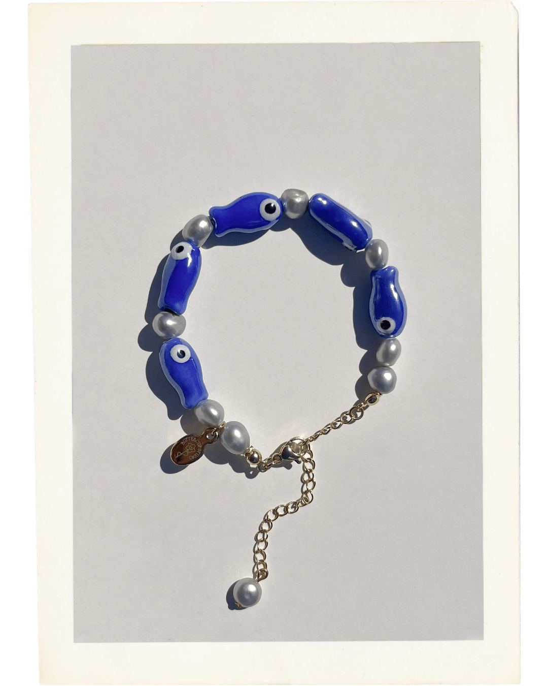 The Lucky Fish Freshwater Pearl bracelet is made using high-quality AA+ rare silver hue freshwater pearls and glazed navy blue fish ceramic fish beads. Finished with 14k gold clasps and an adjustable chain. This exclusive Buttercup Studio item is a limited edition and unisex.