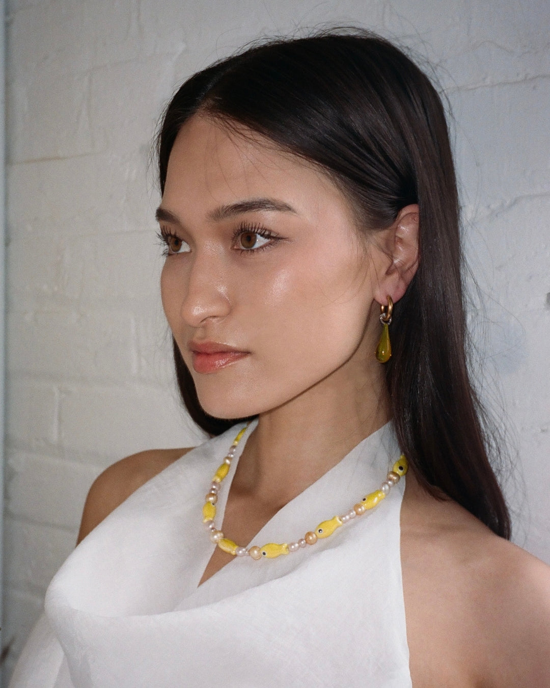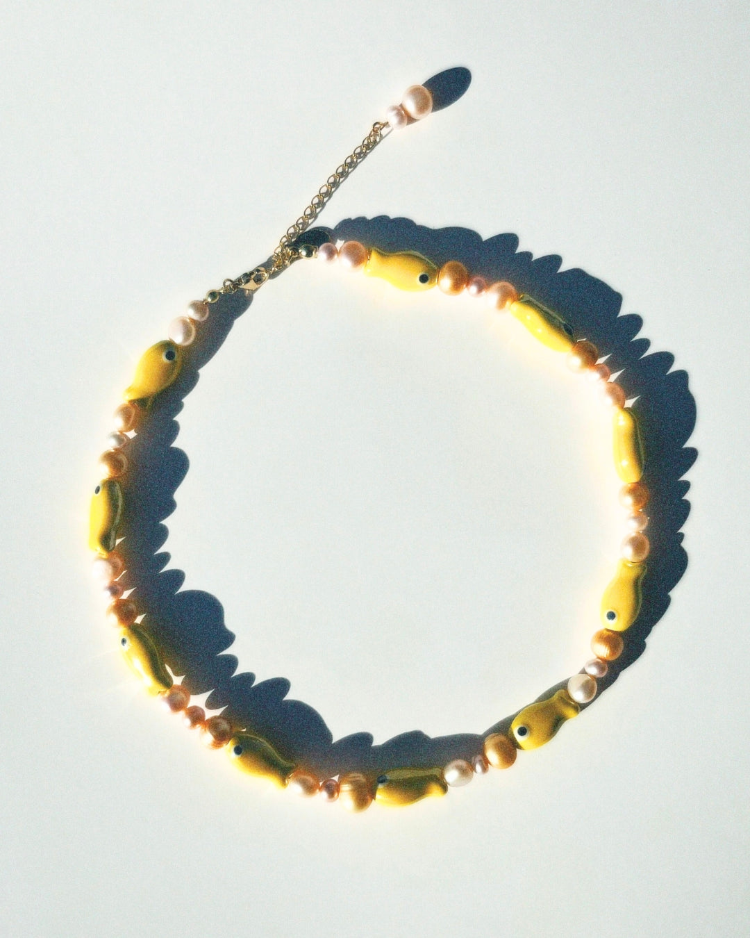 The Lucky Fish Freshwater Pearl Necklace is made using high-quality AA+ rare golden yellow hue freshwater pearls and glazed yellow fish ceramic fish beads. Finished with 14k gold clasps and an adjustable chain. This exclusive Buttercup Studio item is a limited edition and unisex. Pair it with The Celeste Earrings - Honey for the perfect match.