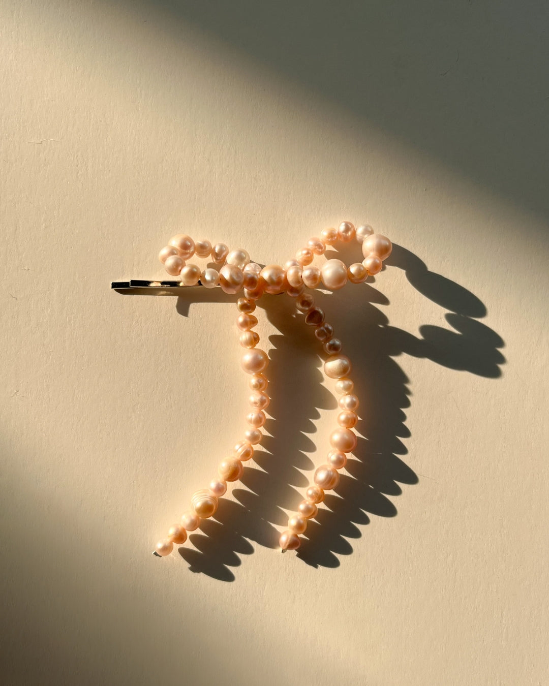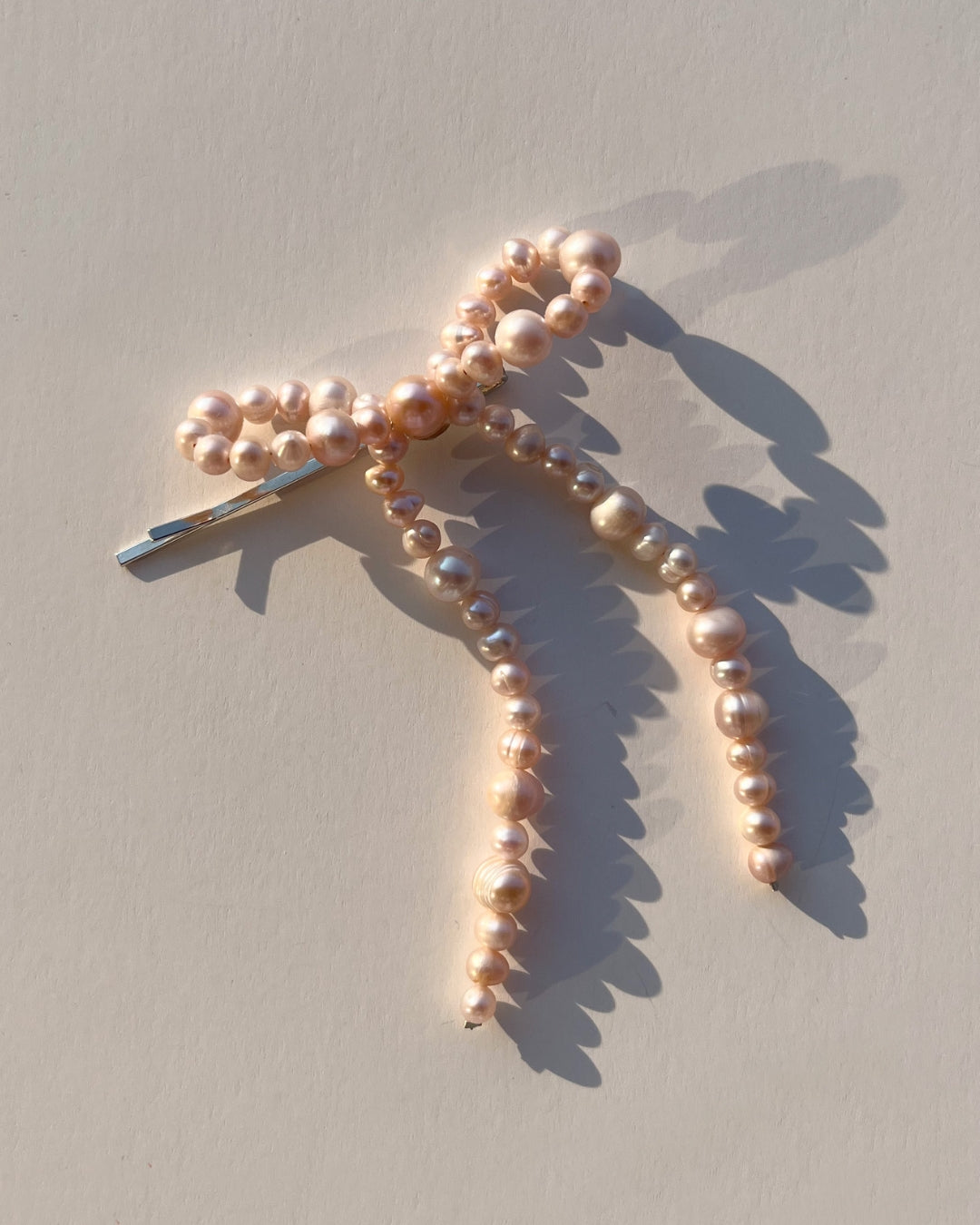 The Mademoiselle Freshwater Pearl Hair Clip is made using high-quality AA+ blush freshwater pearls with sterling silver metal hair barrette. Get a single as a statement piece or get them in double for the perfect pair.