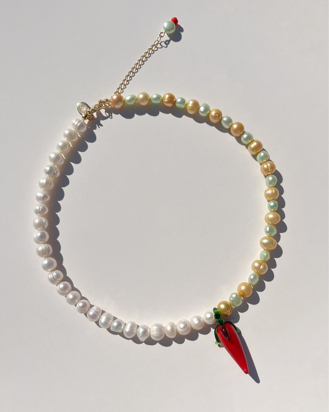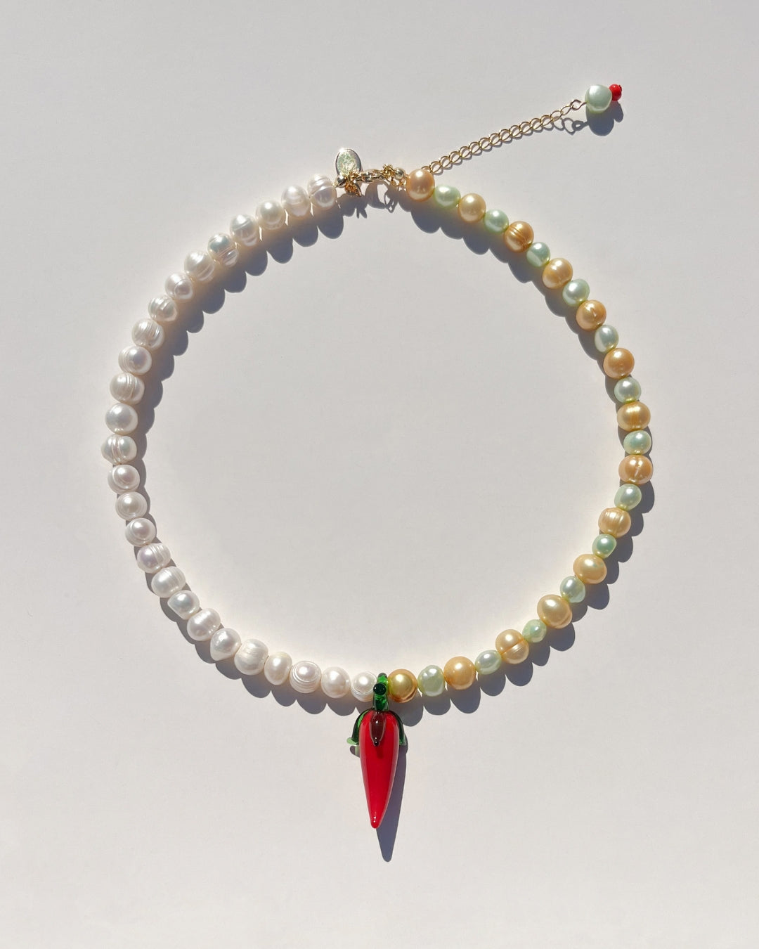 Turn up the heat with the Picante Freshwater Pearl Necklace, featuring a vibrant high-quality AA+ rare yellow and green freshwater pearls and with handmade 35mm red chilli glass charm. Designed for the modern muse, perfect for layering or making a standalone statement, the Picante Necklace is a stylishly spirited addition to any collection, offering a pop of colour that feels fresh, exclusive, and effortlessly sophisticated.
