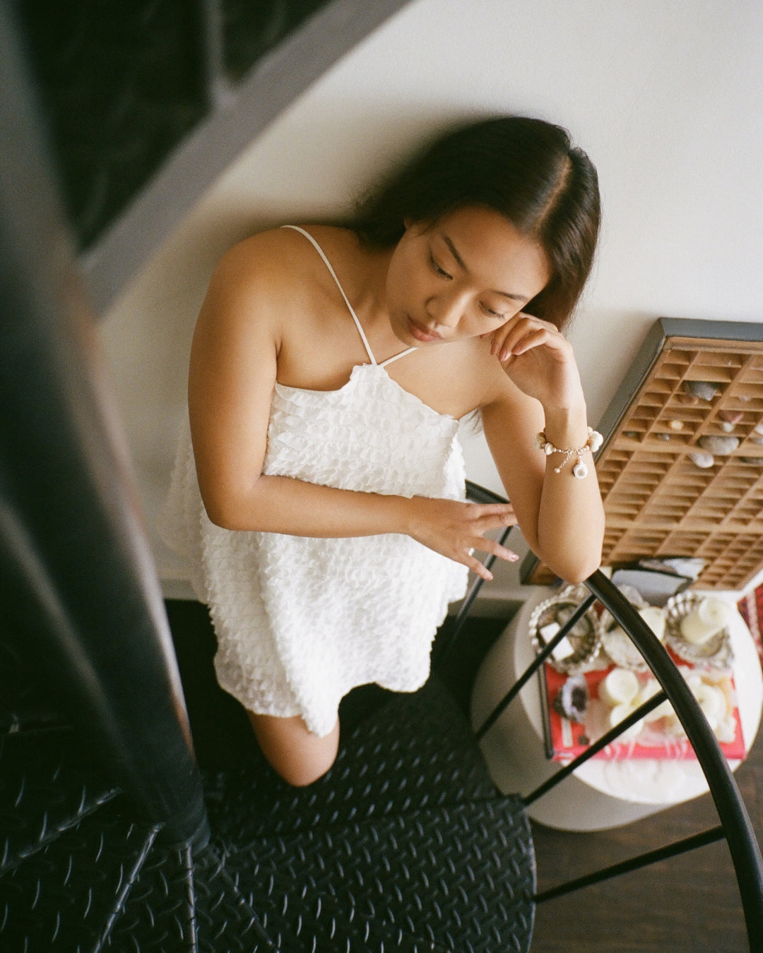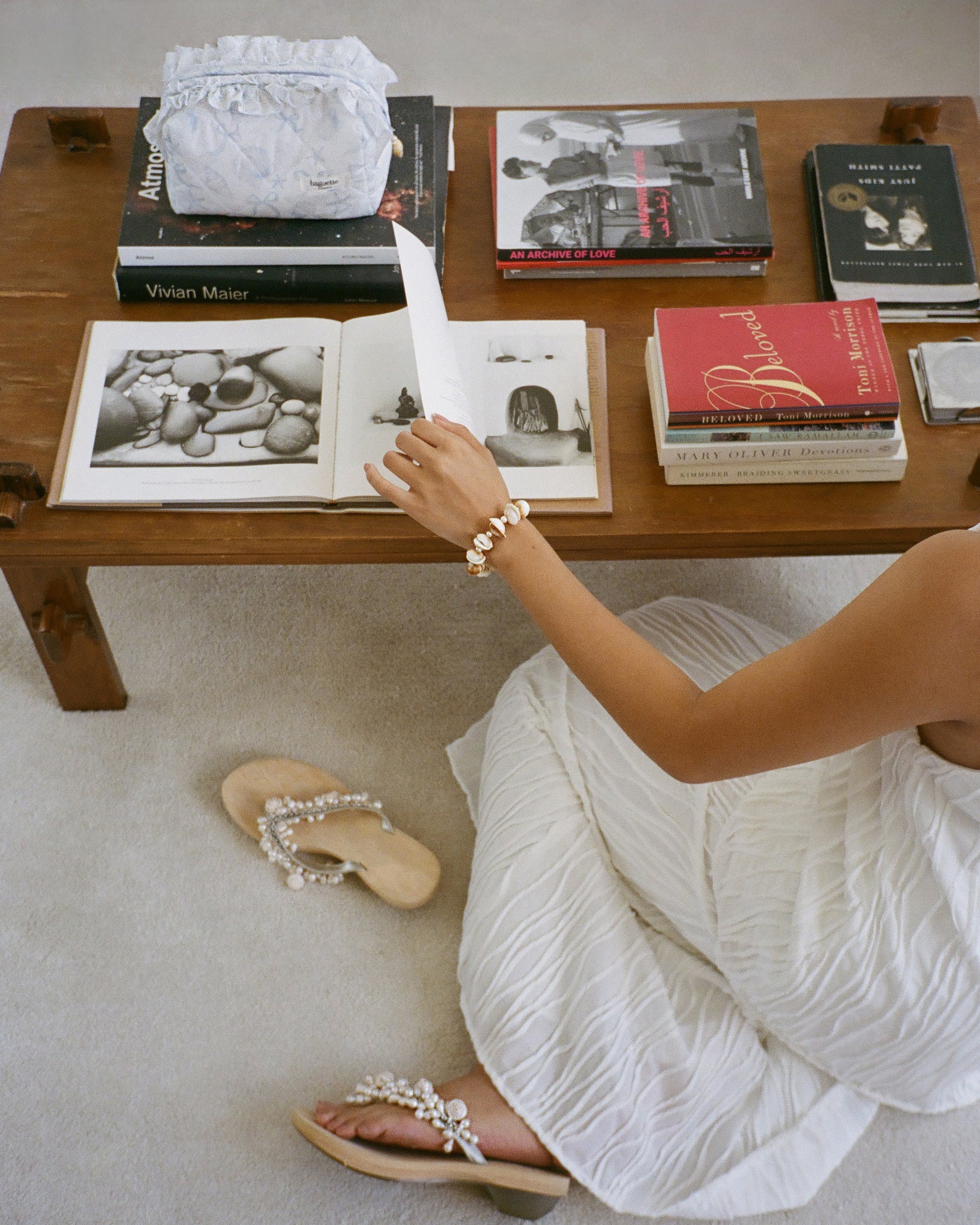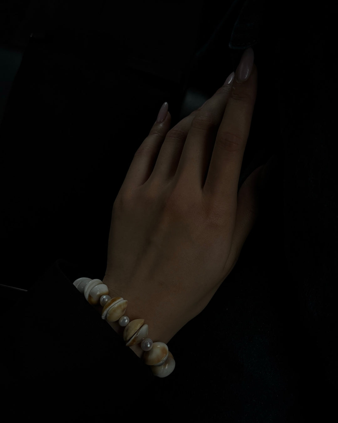 The Baguette x Buttercup Studio collaboration brings together the Limited Edition Ocean Spiral Ruffles Pouch and the Exclusive Sundial Oyster Freshwater Pearl Bracelet. This pairing combines Baguette’s signature ruffled silhouette in a custom print with Buttercup Studio’s refined freshwater pearl jewellery.