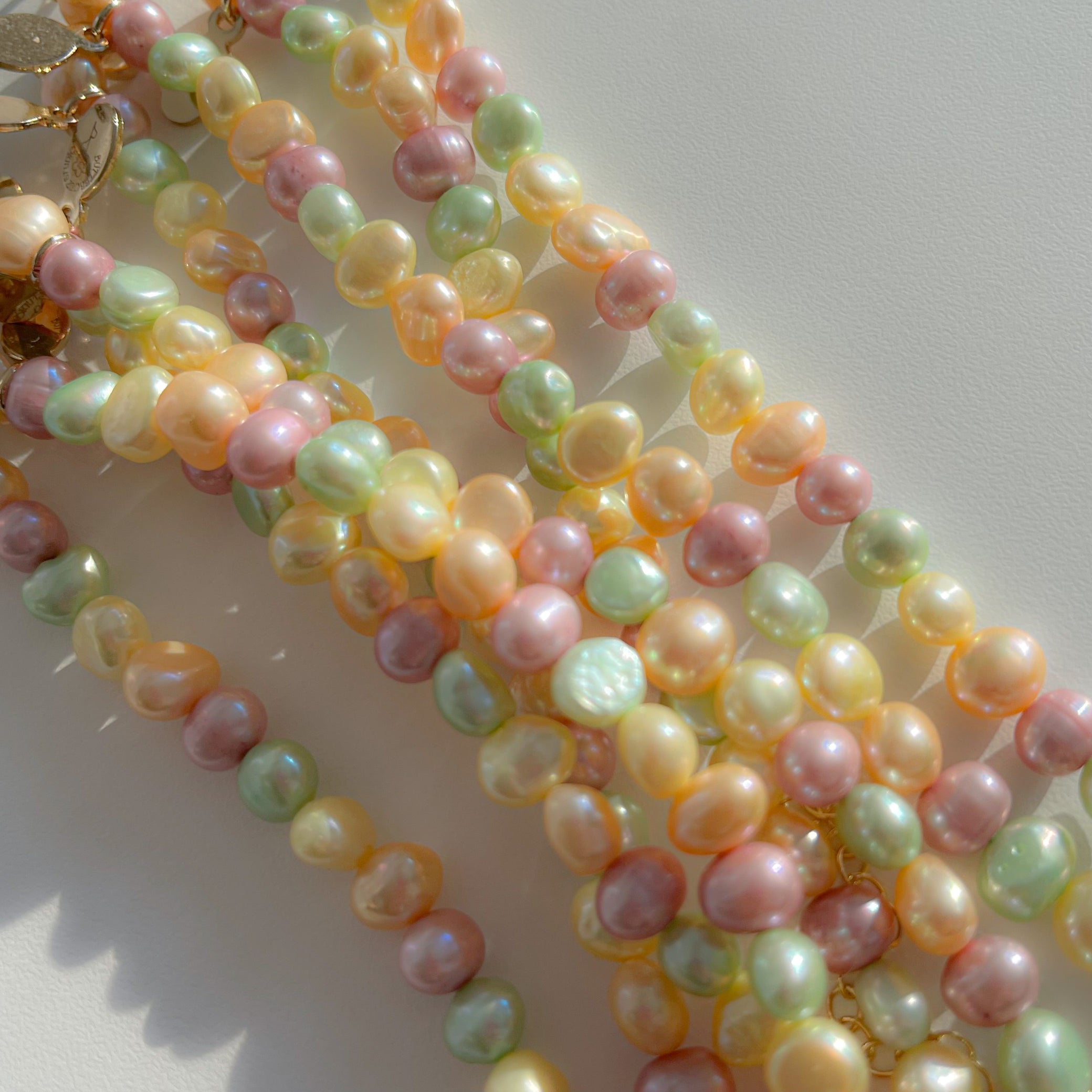 Handmade using locally sourced, hand selected rare pastel freshwater pearls. Finished with 14k gold clasps and a size inclusive adjustable chain. Each piece includes our signature Buttercup Studio 14k gold plated emblem to signify its authenticity.